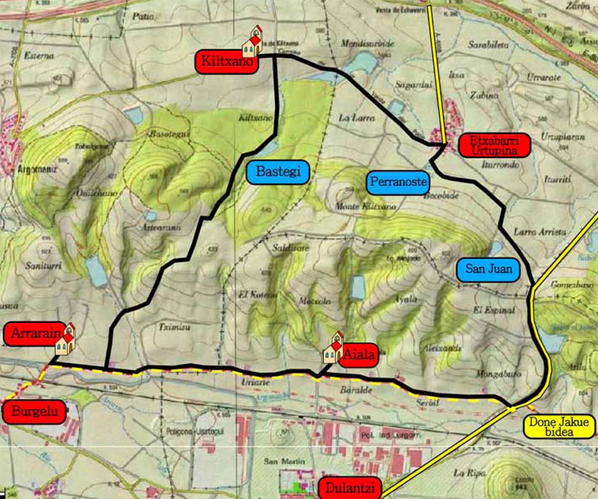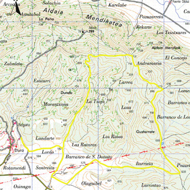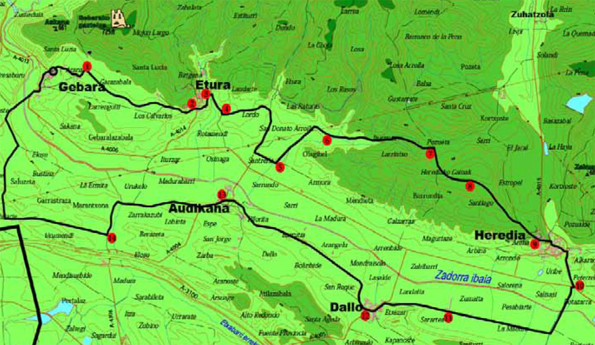 La ruta comienza y finaliza en Gebara, recorriendo un circuito de 12 km que rodea el valle al sur de la sierra de Aldaia. El recorrido pasa por puntos destacados como Etura, Heredia, Dallo y Audikana, combinando pistas cómodas y senderos señalizados con marcas PR (blanco-amarillo). Durante el trayecto, se atraviesan paisajes rurales y montañosos, incluyendo cruces de arroyos, zonas boscosas y antiguos caminos. Es un itinerario ideal para disfrutar de la naturaleza y del patrimonio histórico de la zona.