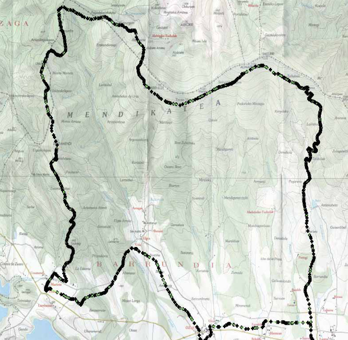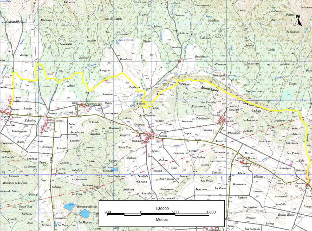 La ruta comienza en Larrea y sigue el recorrido del GR-25, avanzando hacia el norte. Atraviesa paisajes diversos como pinares, ameztiak, y zonas abiertas, pasando por lugares de interés como Barria, con su monasterio histórico, y Bokario, un mirador con vistas panorámicas. El camino incluye cruces de pistas, zonas boscosas, y pastizales, culminando en Galarreta tras un trayecto de aproximadamente 15 kilómetros.