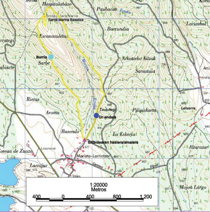 La ruta comienza en la localidad de Marieta, en la zona alta junto al arroyo de Iturraro. Desde allí, se sigue una pista bien señalizada hasta la ermita de Santa Marina, ubicada a 810 metros de altitud. El recorrido ofrece vistas al embalse de Ullibarri-Gamboa y atraviesa bosques y matorrales. El regreso utiliza un camino alternativo que bordea el arroyo Marina y conduce de vuelta al punto de partida.