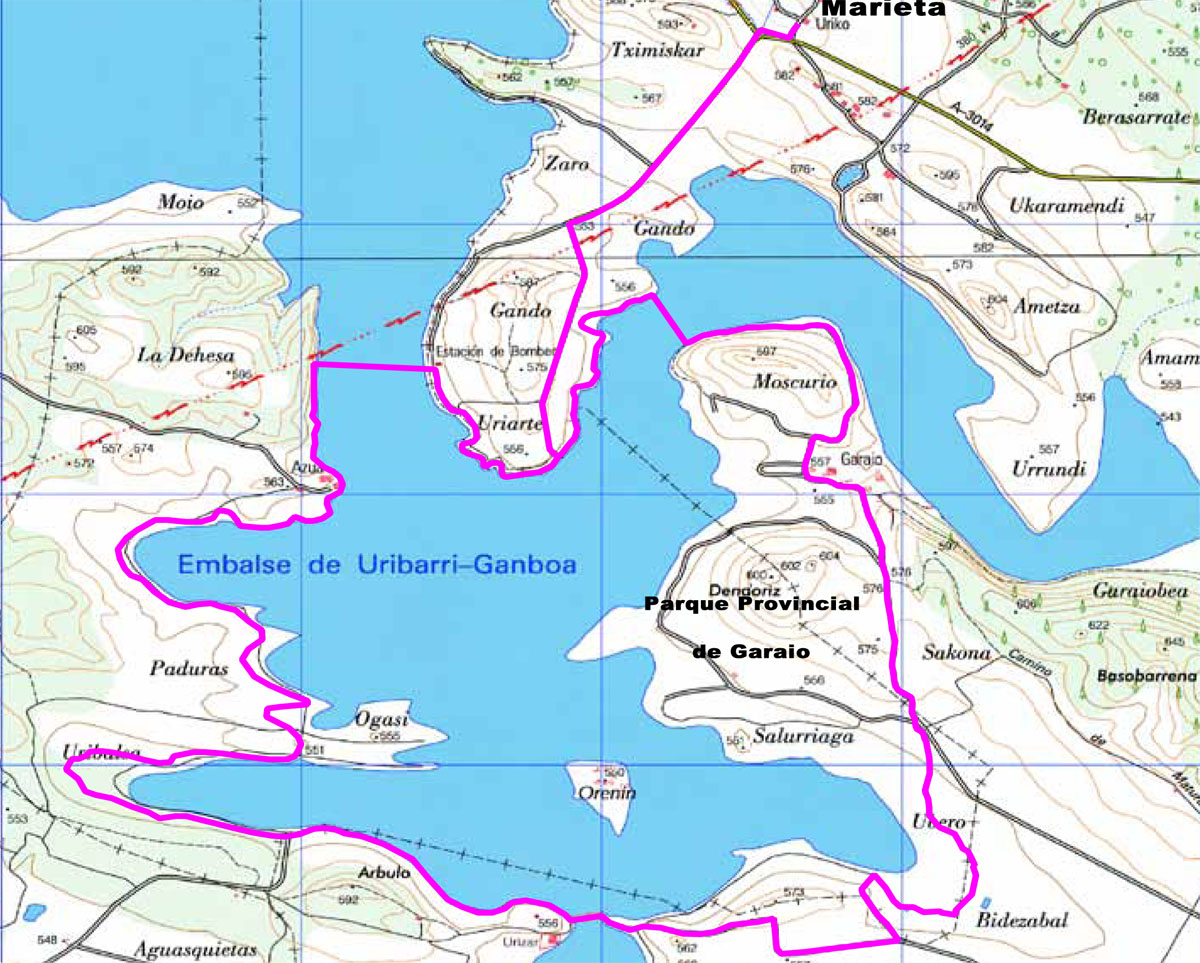 La ruta comienza en Marieta, recorriendo la zona sur del embalse de Ullibarri-Gamboa en una ruta circular de 22 kilómetros. Este itinerario destaca por su valor paisajístico, cultural y natural, incluyendo puntos de interés como el Parque Ornitológico de Mendixur y el Parque Provincial de Garaio. El recorrido, fácilmente transitable, permite disfrutar de observatorios de aves, pasarelas de madera y vistas al embalse. Además, forma parte de la Red Natura 2000 y está protegido por el Convenio Ramsar debido a su importancia ecológica
